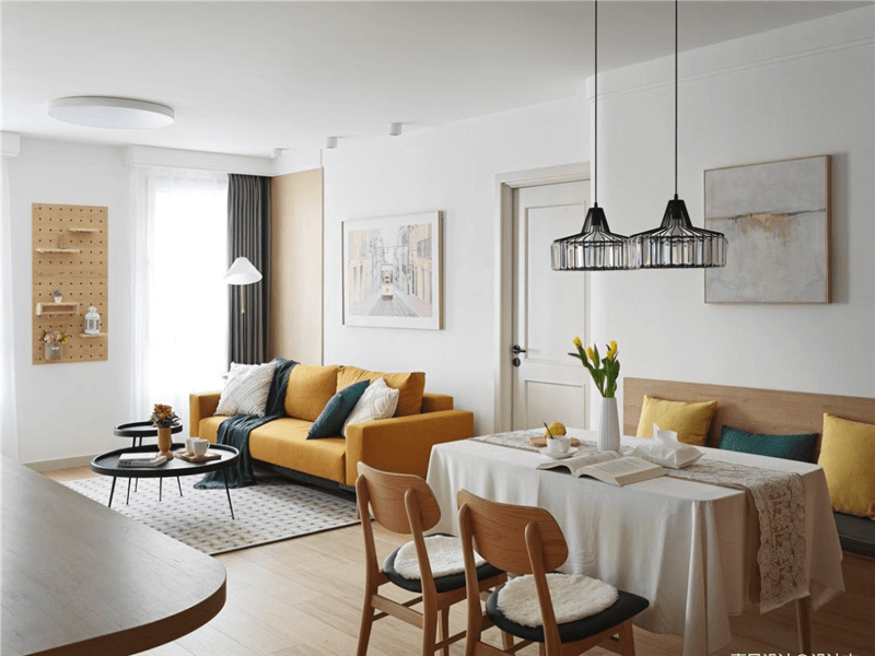 适配木地板的橘黄色一字型沙发,鲜活饱满,明媚了一整个客厅。沙发背景墙铺贴木饰面打破白墙的单调,同时也让墙面造型更加立体生动,其间点缀一幅浅色系的装饰画,整体简而不繁,清新脱俗。