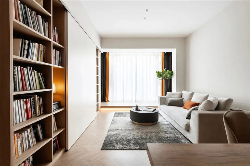 客厅与阳台打通,引入更多自然光线,空间宽敞且明亮。阳台区域铺设地台作为休闲区使用,充分发挥了阳台采光好的优势。电视墙设计一整面收纳柜用于展示屋主收藏的图书,为避免积灰还特地做推拉门设计。