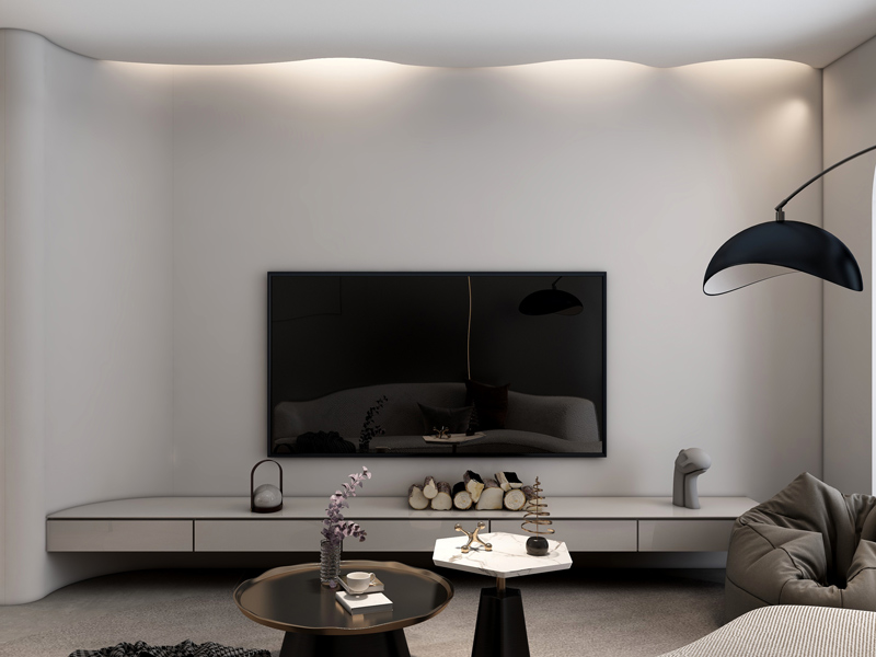 客厅纯白的基础墙面,搭配简洁的悬空电视柜,避免卫生死角,造型吊顶与隐藏灯光的融入呈现出舒适休闲空间。