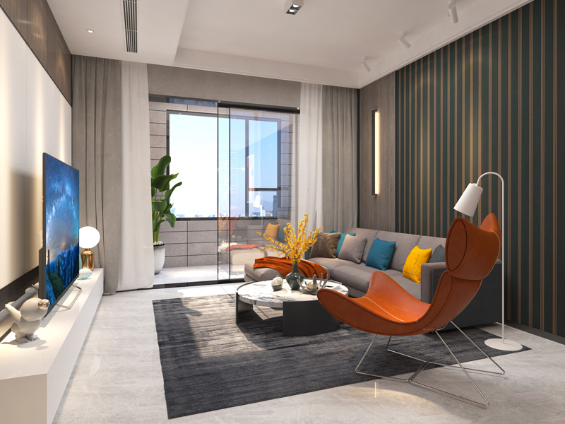 客厅深色背景墙设计给人稳重的空间质感,同时带出空间层次,活力的橙色座椅进行点缀,空间更显灵动。