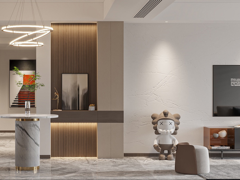 格栅与灯带搭配设计的虚拟玄关区域,吸引视线,呈现丰富空间层次感,提升空间精致时尚感。