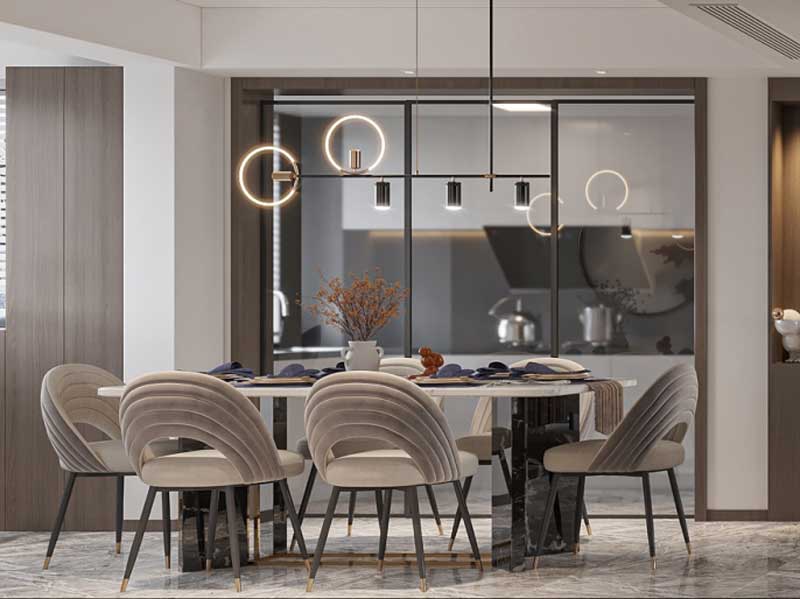 餐厅区域采用开放式布局在厨房外侧,动线便捷合理,提高生活效率,营造放松实用的用餐氛围。