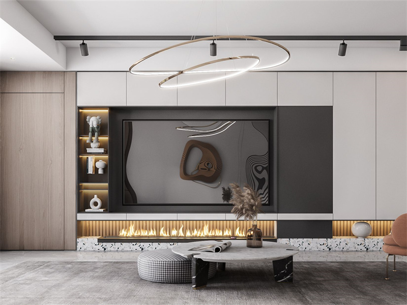 电视墙收纳与展示一体,保证区域储物需求,大理石台面增添质感,深浅搭配,简洁又有层次,打造实用又惬意的客厅环境。