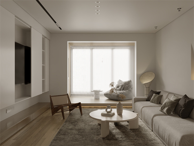 客厅设计兼顾层次与舒适,浅灰沙发配圆形茶几,简约大方。靠窗的豆袋椅和小边几,打造出专属休闲角,嵌入式电视墙与柔和灯光相衬,营造出温馨氛围,尽显现代简约的居住品质。
