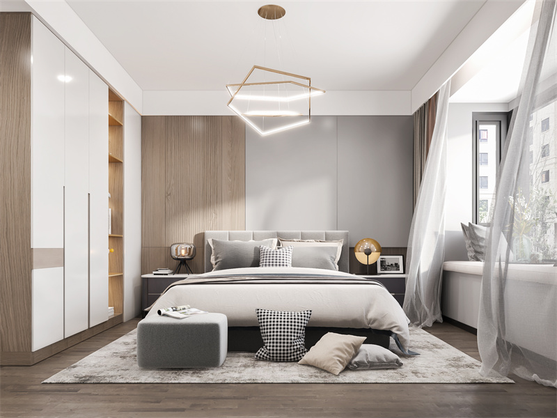 卧室通过材质分层营造舒适感,背景墙用木饰面搭配撞色,提升层次感,几何形艺术吊灯提升设计感,柔质床品增加细节质感。