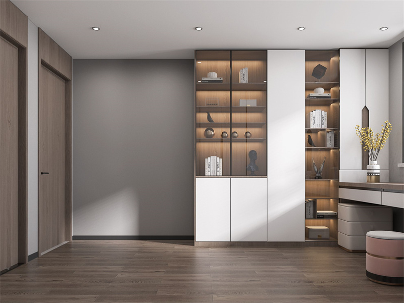 通过灯光与材质营造精致感,柜体做玻璃开放格+封闭柜组合,强化审美,浅粉座椅作为跳色亮点,打破色调的平淡。无主灯设计保证空间通透,桌面绿植点缀细节。