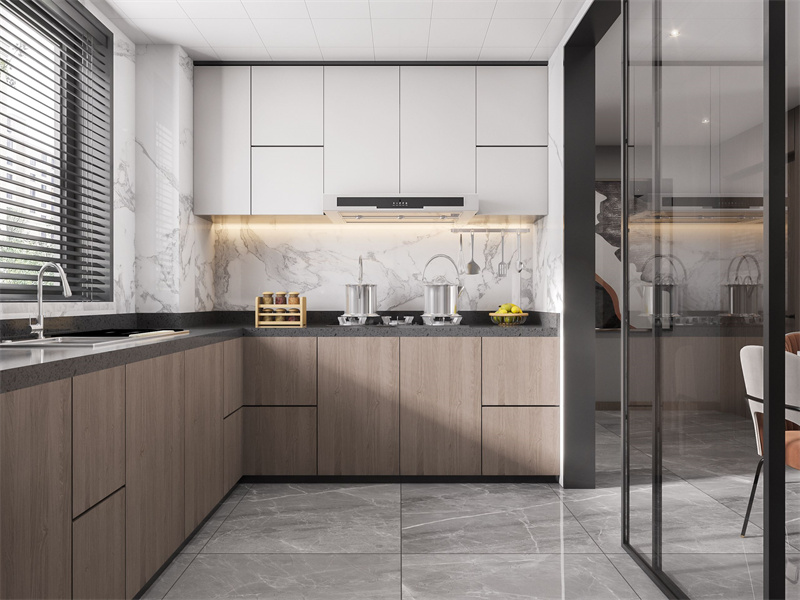 厨房采用上下柜设计,木色、白、石纹为核心材质,配合嵌入式灯带提升操作亮度。玻璃隔断衔接餐区,既区隔油烟又保持通透感,实现实用与简约美学的融合。